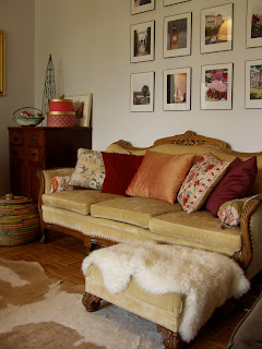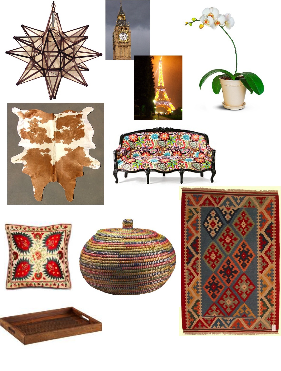 Starting from top left: Moroccan Star pendant light http://www.directfrommexico.com/starlights.html , Photos from our travels, phalaenopsis orchid, Sofa from anthropologie, Kilim rug, Grass basket www.tenthousandvillages.com, wooden serving tray www.target.com, Suzani pillow www.uzbek-craft.com/, cowhide rug cowhidesinternational.com/.