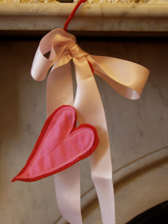 They are pretty simple. I just used a red and white felt and a few types of pink and patterned fabric. I cut out some free formed hearts and sewed them with my machine. And I used pipe cleaners to hook them on the mantle and ribbon to tie them to the door knobs.
