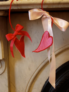 They are pretty simple. I just used a red and white felt and a few types of pink and patterned fabric. I cut out some free formed hearts and sewed them with my machine. And I used pipe cleaners to hook them on the mantle and ribbon to tie them to the door knobs.